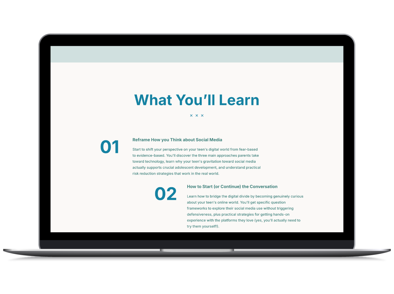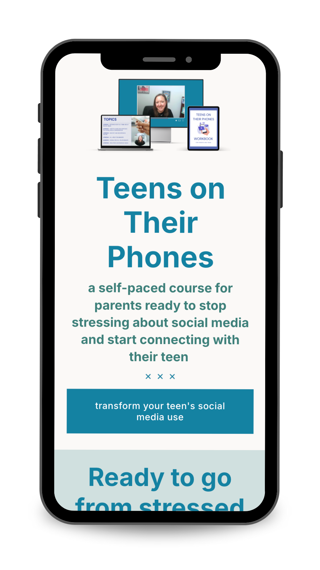 “My product is Teens on Their Phones, a self-paced course and workbook that helps parents foster healthy social media use in their teens. The course helps parents have successful, meaningful conversations with their teen about how to navigate the digital world and avoid imposing unrealistic rules (or throwing their phone out the window!).