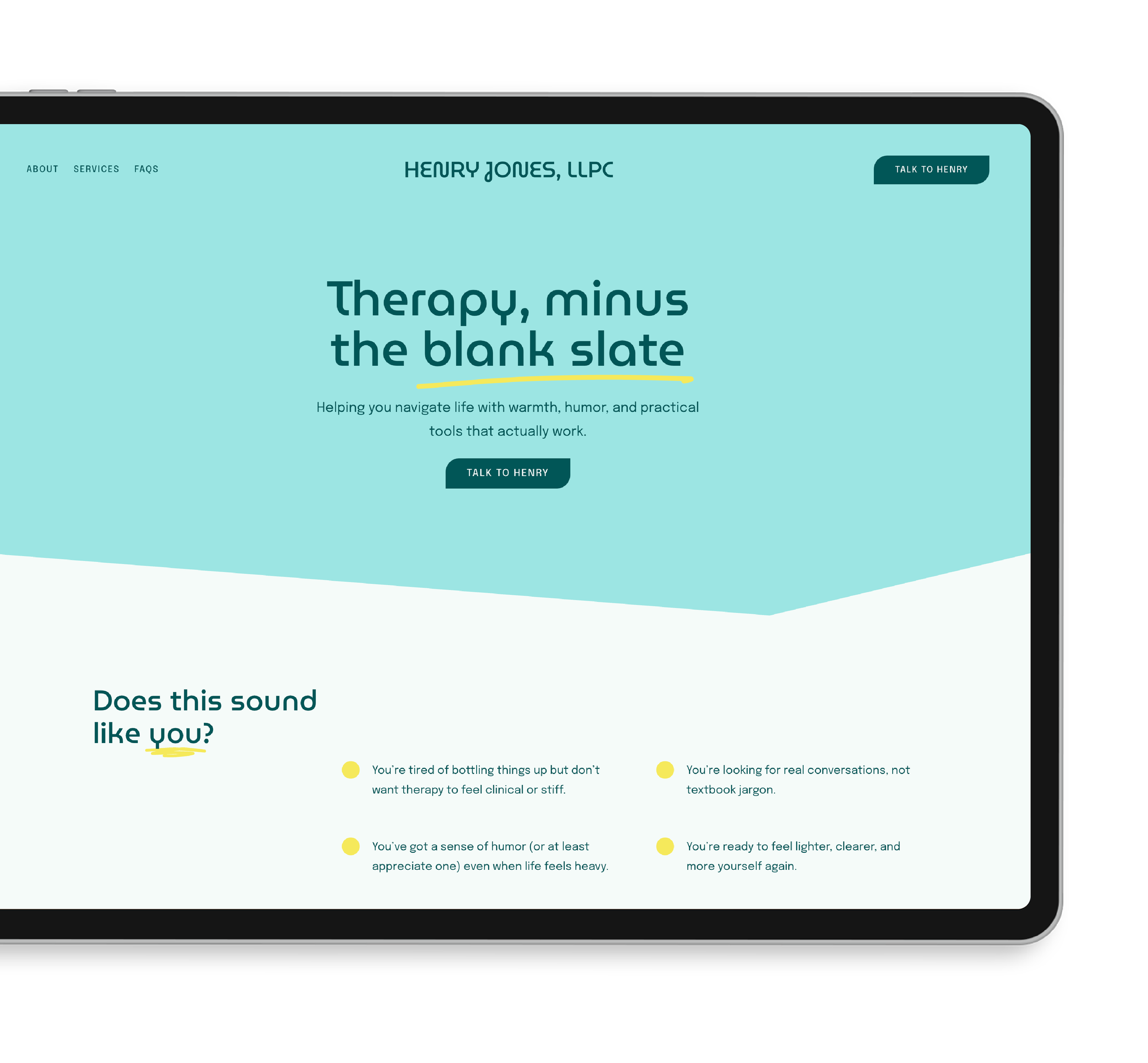 "Henry" was designed for mental health counselors and service providers looking for a website that stands out from the crowd. This one-page website’s bright color scheme and dynamic design are anything but generic.